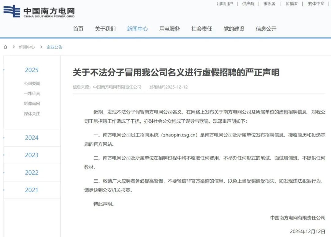 声明称,近期发现不法分子假冒南方电网公司名义,在网络上发布关于南方电网公司及所属单位的虚假招聘信息,对其公司正常招聘工作造成了干扰,亦对社会公众构成了误导与欺骗。
